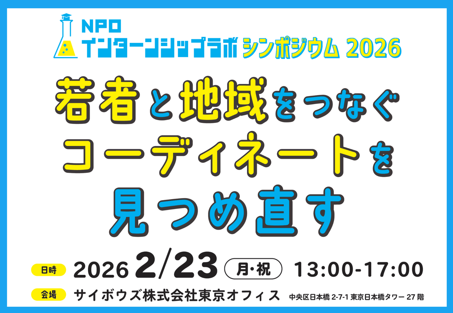 そこで2026 年は、「若者」「地域」「つなぐ」を見つめ直し、各地で活動するコーディネーターが集い、実践知や課題を共有するシンポジウムとして開 催します。世代や立場を越えて学び合い、若者と地域をつなぎ続ける意義やれからの可能性をともに語り合う場をつくります。