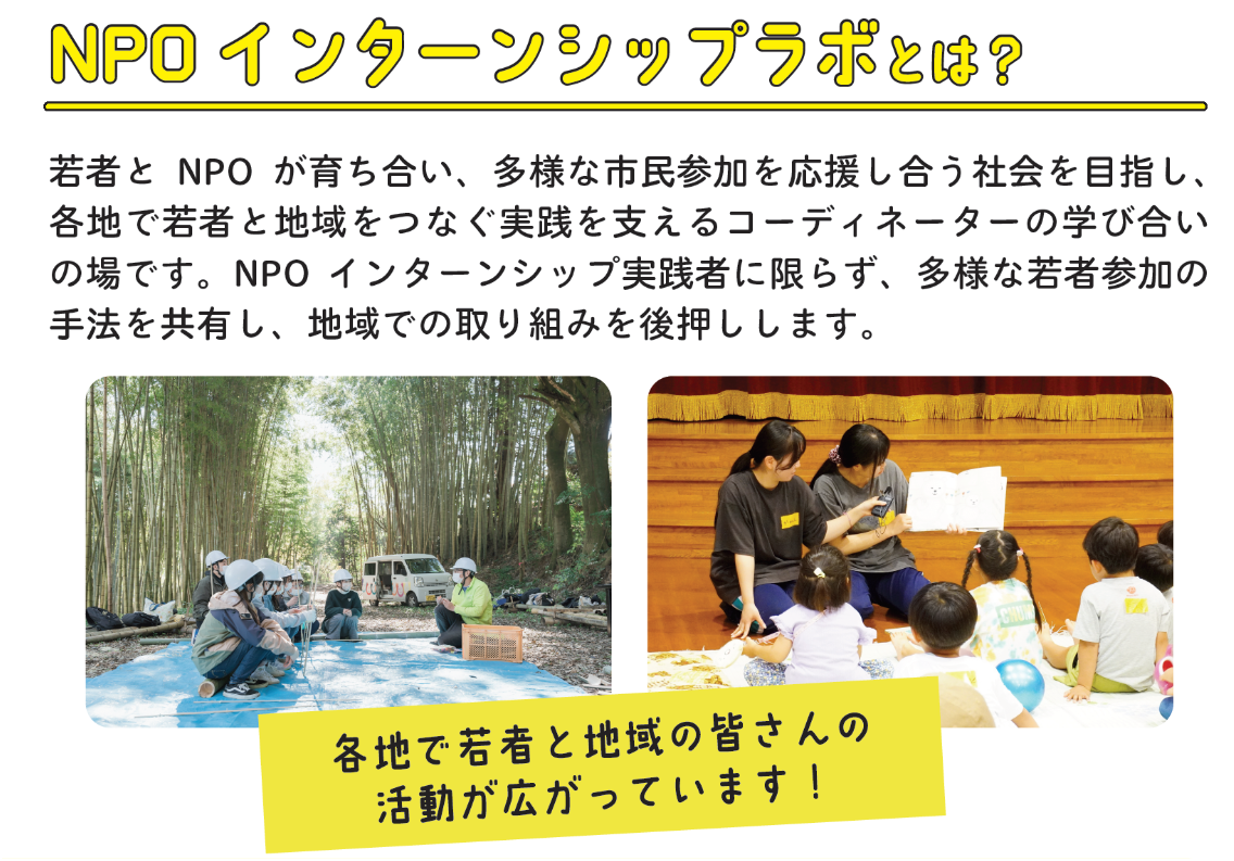 NPO インターンシップラボは、市民活動の「種まき」として若者の地域参画を支えてきたNPO インターンシップのコーディネーターの集まりから始まりました。